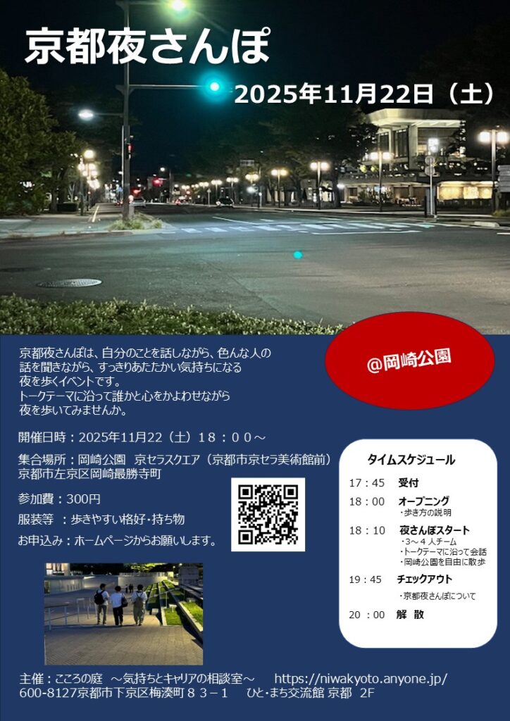 第6回京都夜さんぽのご案内です。日:2025/11/22(土)時間:18:00~20:00 [17:45受付開始](雨天決行)場所 : 岡崎公園 京セラスクエア(京都市京セラ美術館前)お申し込みはここをクリック京都夜さんぽって?